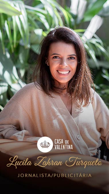 Sobre Lucila Zahran Turqueto - Formada em publicidade pela ESPM, jornalismo pela Cásper Líbero e pós graduada em administração na Fundação Getúlio Vargas. De diferentes maneiras, sua formação acadêmica e sua experiência profissional - trabalhou em agências de publicidade e mais de 8 anos na TV Globo - contribuíram para a criação do Casa de Valentina no ano de 2008.