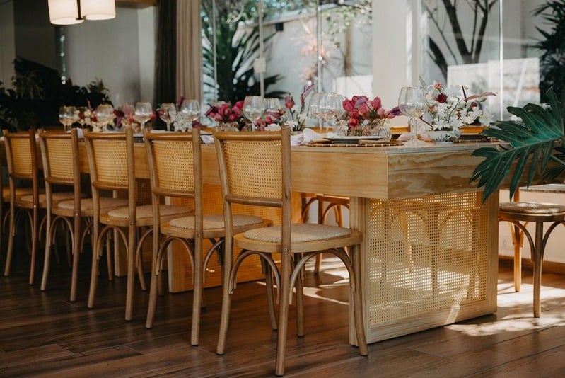 As mesas, balcões e aparadores com o seu toque em laca, madeira e ferro e acabamento em palha natural trazem uma diversidade de composições para os salões de festas, tornando-o, assim, um ambiente onde as pessoas podem se sentir leves e mais à vontade.